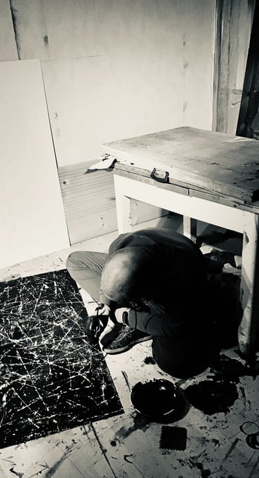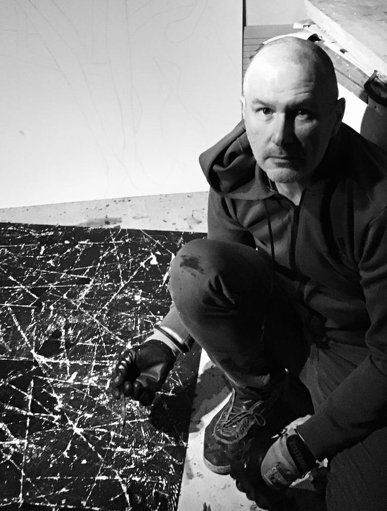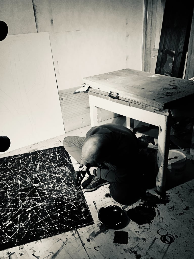 je sillonne sur différents sentiers. Il y a le trait, brutal sur des aplats de couleur vives, qui rythme et dit une présence. Le trait qui signifie et garde tout son mystère. La joie enfantine de la trace, de l'empreinte laissée. Une peinture rupestre de l'immédiateté. Il y a l'austérité voulue des estampes monochromes, et des volumes en bois brûlé. Les compositions 3D qui libèrent les sérigraphies de leur support, les mannequins rendus à leur destin. tout matériau est bon. Il s'agit d'une traversée, de moi inconnu, et qui le reste malgré tout. Une errance bienfaisante et euphorique dans l'archéologie de l'intime. Oui je cherche un (dés)équilibre, une figure rythmique, une émotion, mais en fin de compte le but est de chercher. Chaque travail me rassure momentanément sur mon incarnation au monde. C'est une question sans objet et un remerciement. Une prière à l'intention de l'instant présent. Avec l'éblouissement comme le moindre des remerciements à adresser à la beauté du monde.