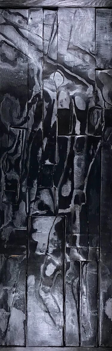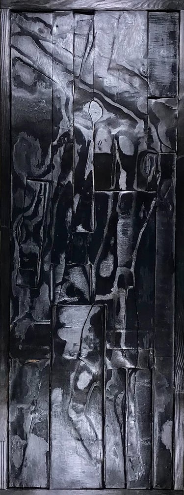 Bertjeff emprunte la technique traditionnelle japonaise du bois brulé, Yakisugi, aussi appelée Shou sugi ban.